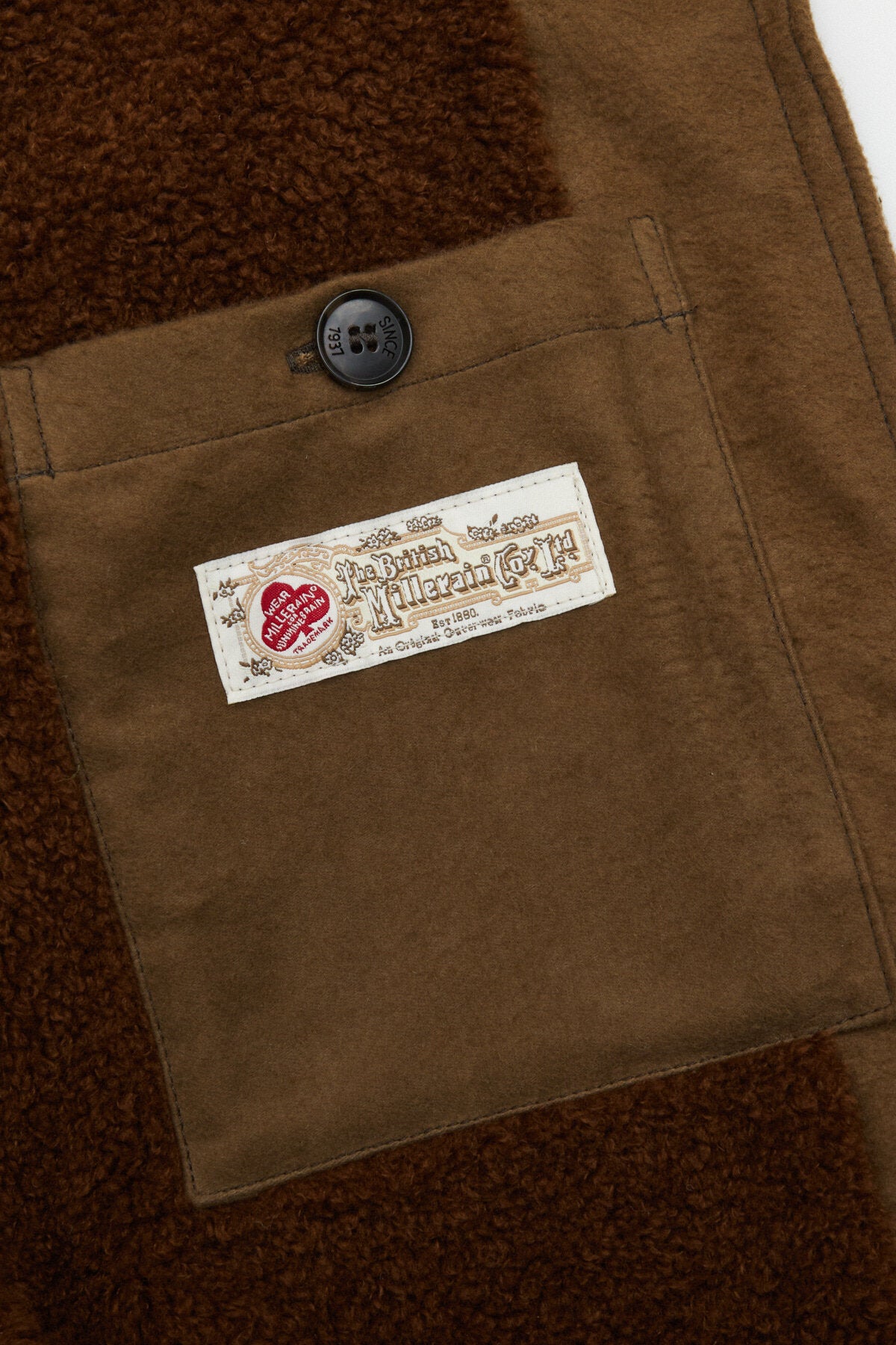 • • Innentasche in einer Kontrastfarbe mit personalisiertem Knopf und British Millerain Label
