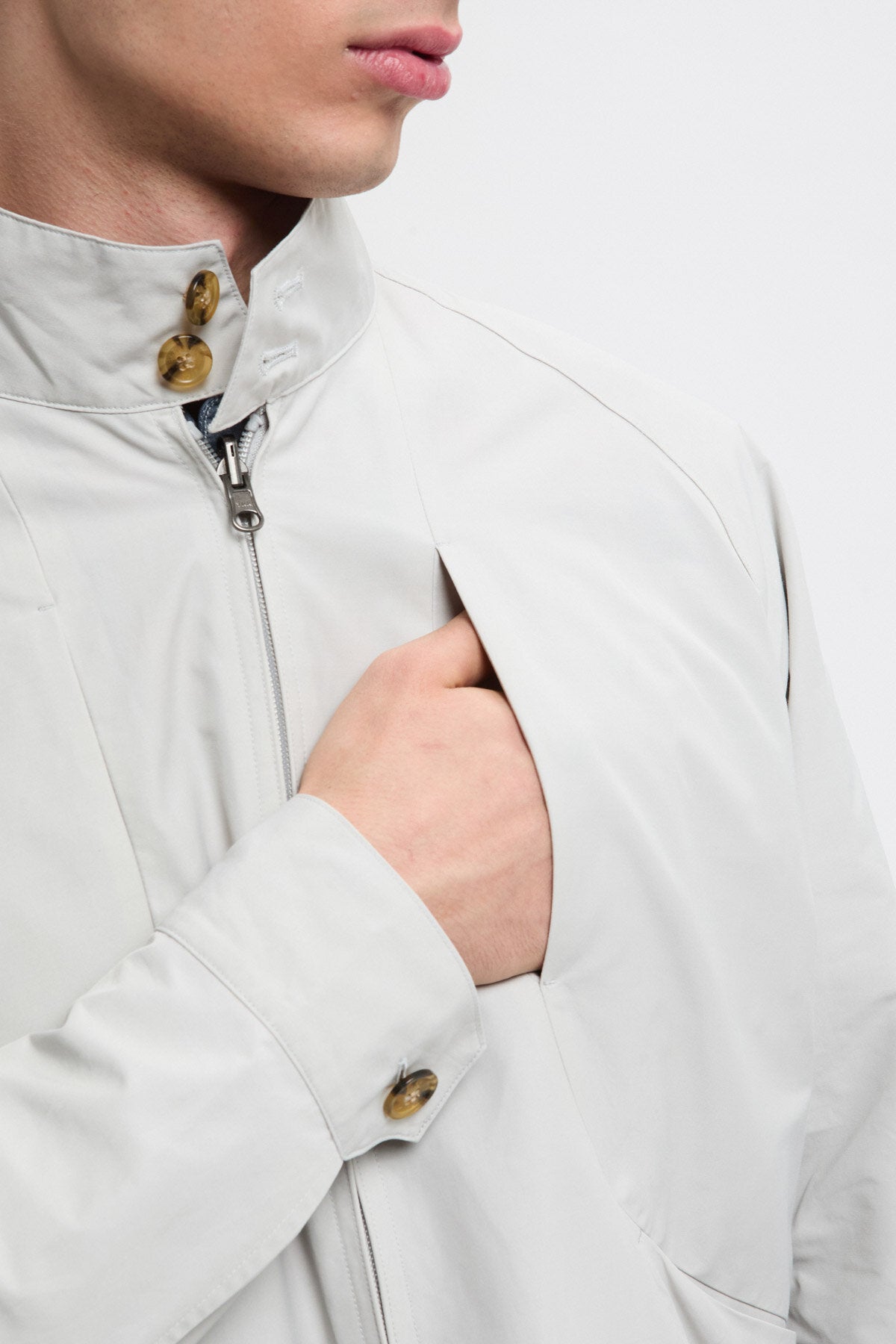 • • Collo in piedi con chiusura a doppio bottone