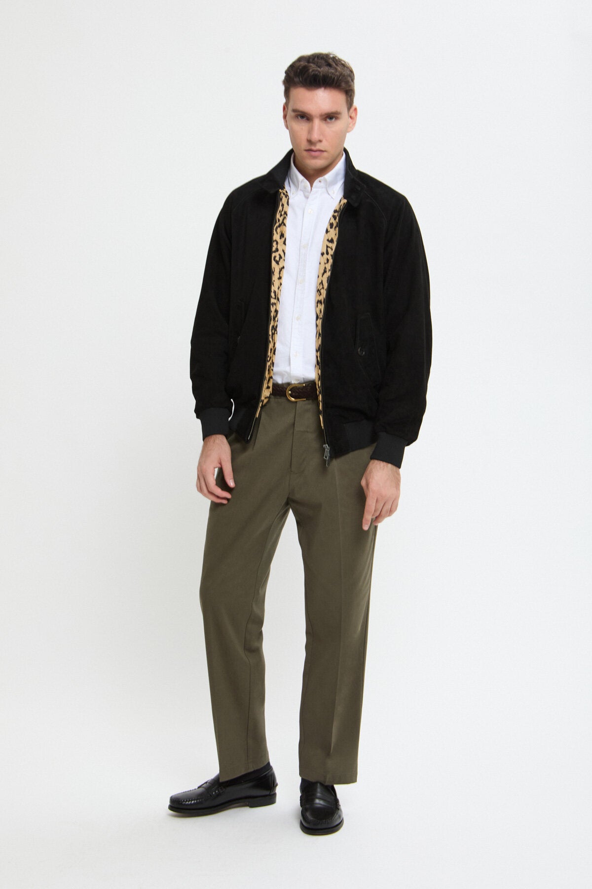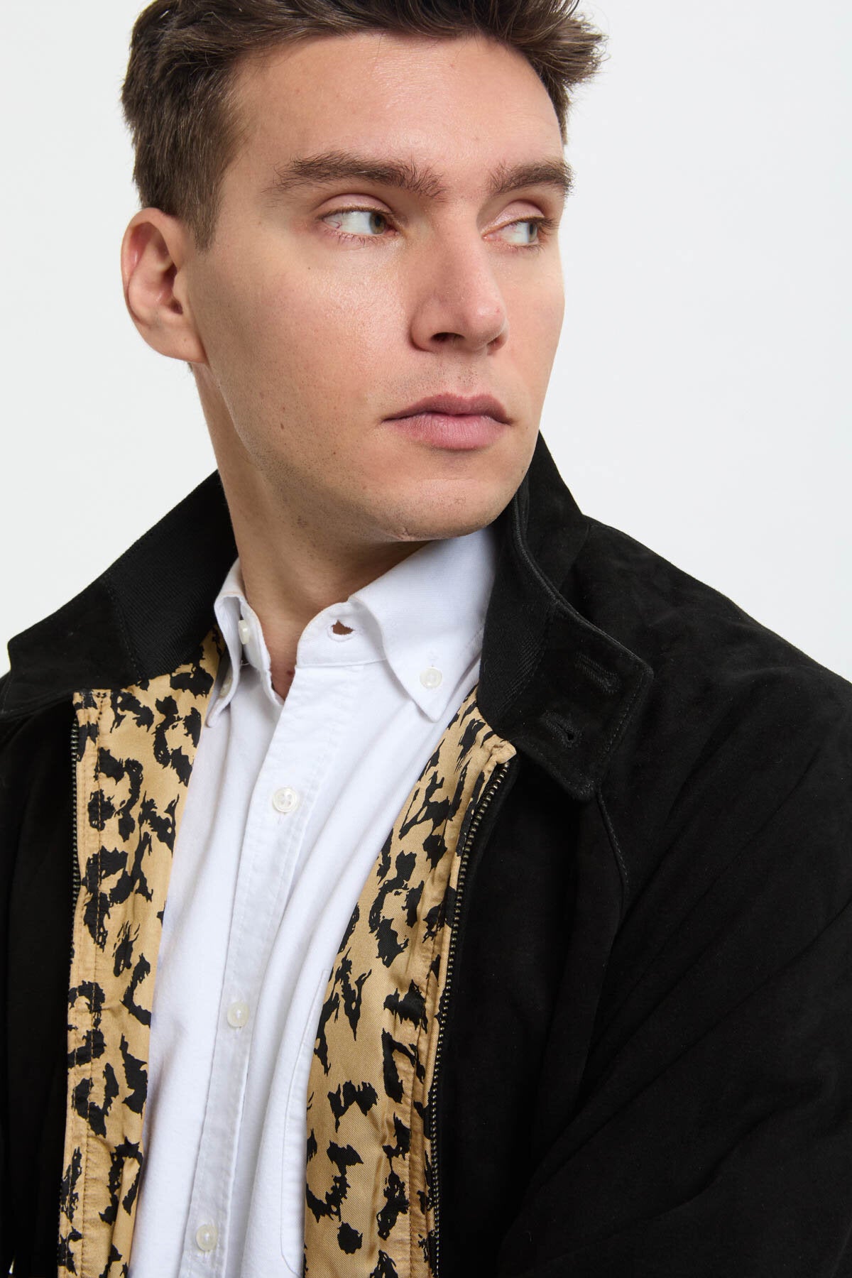 • The G9 Suede x Wacko Maria returns in a striking animalier edition, in three standout colourways: Black, Tobacco, and Chocolate. The outer layer is crafted from premium Baracuta suede, while inside the iconic leopard-print lining brings unmistakable Wacko Maria attitude, finished with a subtle metal chain loop detail. Both the design and fit have been updated, featuring a looser cut for a softer, unisex feel.